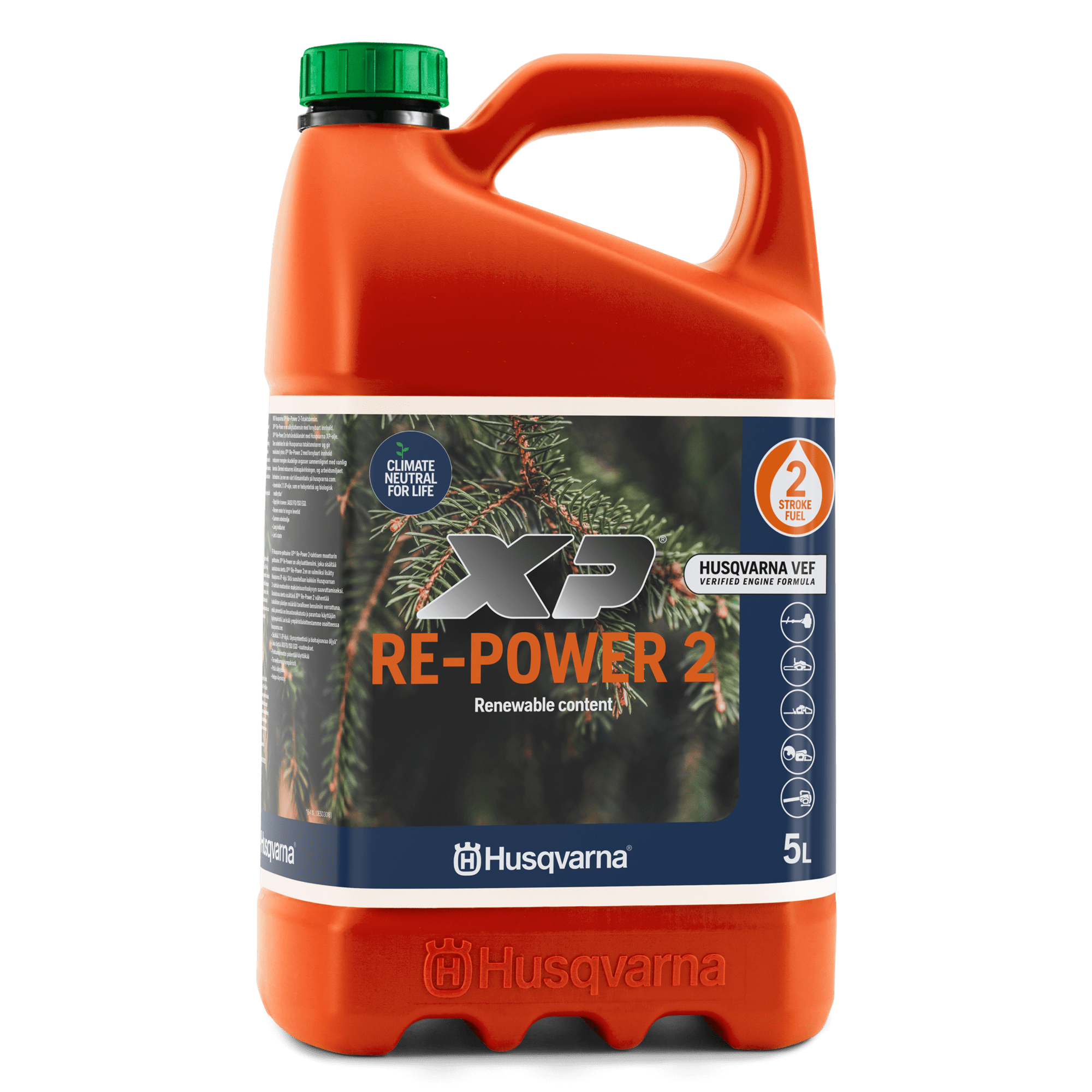 XP® Re-Power 2 är en alkylatbensin blandad med 2% Husqvarna XP® 2-taktsolja. Den rekommenderas för alla Husqvarna tvåtaktsmotorer och ger maximal prestanda. XP® Re-Power 2 med förnybart innehåll minskar mängden skadliga utsläpp jämfört med vanlig bensin, vilket minskar klimateffekten och förbättrar din arbetsmiljö.