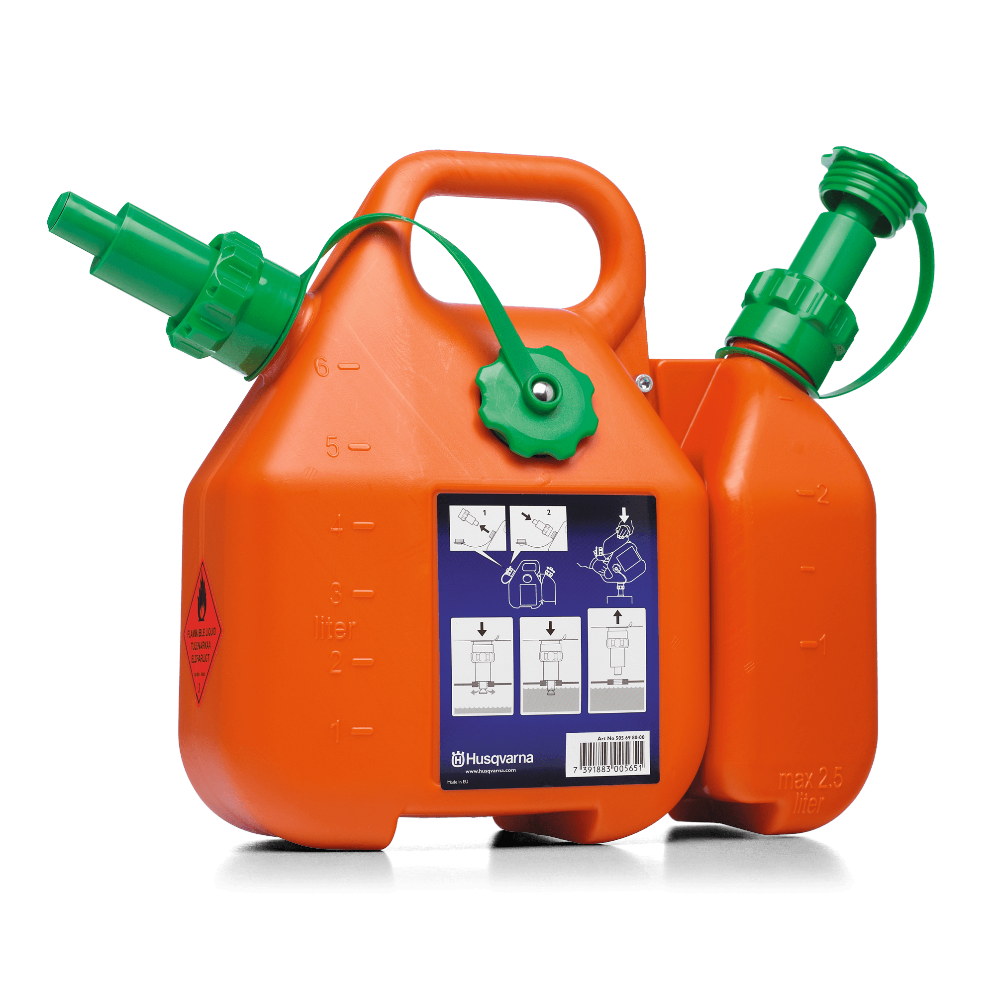 Denna kombidunk är försedd med ett effektivt överfyllningsskydd. När tanken är full stängs tillförseln automatiskt av och du kan lyfta upp dunken utan att spilla. Dunkarna kan skiljas från varandra. Mellan dunkarna finns plats för filar och andra verktyg.